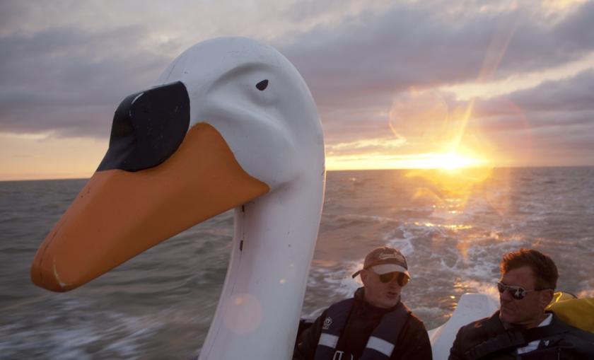 The scenery is idyllic, the camerawork exceptional and the participants waywardly eccentric; the scene seems set for a memorable voyage, except that Sinclair begins making portentous pronouncements: “The absurdity was to take a plastic swan and peddle it until it became a real swan and we ourselves would evolve into birds…and that transformation would be the essence of the journey.”