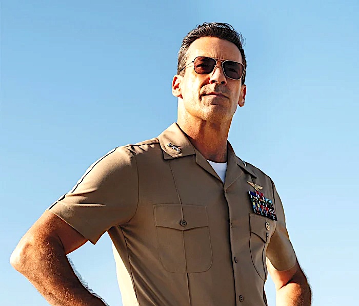 When the story opens, Maverick is a test pilot flying a revolutionary aircraft that he manages to crank up to Mach 10.2 before it falls to bits, which earns him a bollocking from the gruff, no-nonsense Rear Admiral Cain (Ed Harris). How come, he asks Maverick, that after all this time he’s still only a Captain and not an admiral or a Senator? The answer, of course, is that flying is Maverick’s first and only love (sorry Penny), and somehow he’s still piloting the fastest machinery on earth at age 60. He’s saved from being benched permanently by the one-last-mission job, where he’s only supposed to be the instructor. But, to the chagrin of mission commander Vice Admiral “Cyclone”(Jon Hamm, pictured below, who could easily have handled a more fully developed role), the mission is so complicated and hazardous that Maverick is the only man who can lead it.