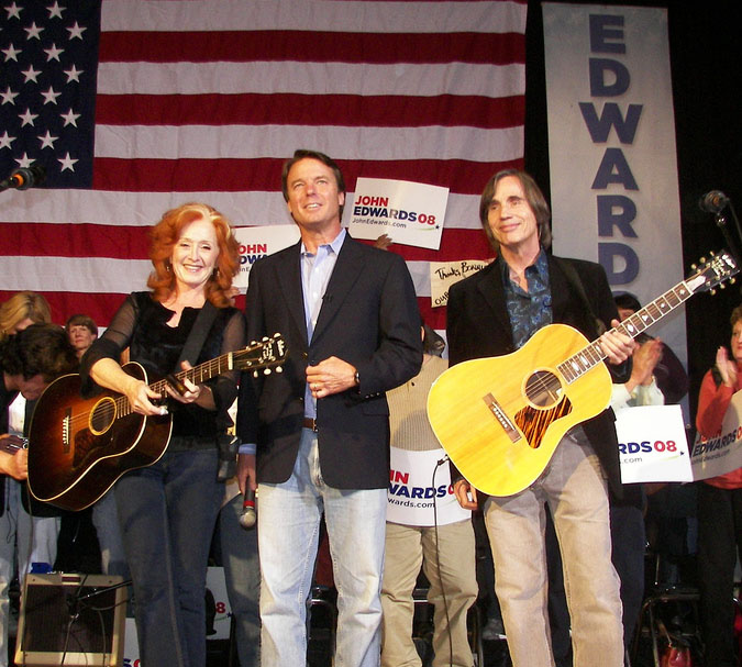 It refers to things like gun massacres and the Gulf oil spill. I think there've been 37 massacres since Sandy Hook or something, it's an incomprehensible amount. There are guns in the hands of people who shouldn't have them, clearly, and not one of these politicians is able to get a law through. There's a certain rancour developing for the whole political class of people that are moribund and can't seem to make anything happen. The problem is of course not them but us – we're the ones that can't make them do anything. We're subject to all kinds of advertising, to political messaging, and the National Rifle Association is this incredible political force and they represent the gun manufacturers, though they pose as representing gun owners. It's the manufacturers that control the NRA and who all the politicians have to contend with. Either they're craven politicians who simply serve the interest of the NRA or they're brave politicians who oppose them but all these struggles are going on in the populace, in people's minds and hearts. I don't know what I'm trying to say. I just think that it takes passing laws, and at this point laws are passed by whoever has the most money. That's our problem. I'm not going to give anybody any money any more. Fuck them. Progressive people are being asked in all these appeals saying "help us fight back at the Koch brothers [right-wing billionaires who fear that America is being overrun by communism], can we have $15 to try to counter the billions that are being spent by the right wing?" It's just foolishness. Either that or admit that democracy doesn't work because it's been defeated by the super-rich. Democracy has been completely unhooked (Browne and Bonnie Raitt campaigning for 2008 Democratic Presidential hopeful John Edwards, below).