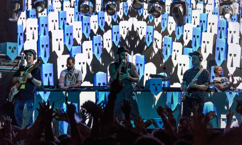 An unusual feature of the band is that the visual artist Filipe Cartaxo, responsible for graphic art, photographs and videos is considered an essential member, and their live imagery and backdrops are almost Kraftwerkian in their considered use. Their logo, more than a mere gimmick, is a stylised mask, which are also handed out to the audience, because for BaianaSystem “image communication is done in mobile graphics modules, organized as a systems language. The mask appears as a personification of a 'being', a bond with the public, making it become an integral part of this 'system'.” (That may sound better in the original Portuguese.)