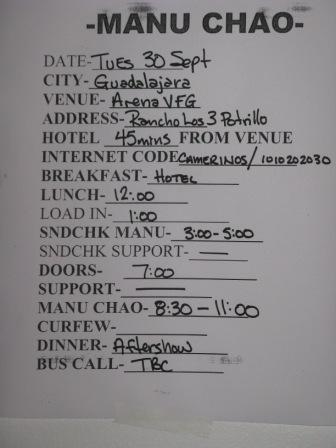Then it’s all over. The band are wiped out but exhilarated. ‘It was like a temazcal out there,’ Manu says, referring to a pre-Hispanic sweat lodge that, he explains, was used as a kind of healing sauna. Not many fans have managed to get into the backstage area, but Manu, of course, chats to them for at least an hour, posing for shots taken on their camera phones.