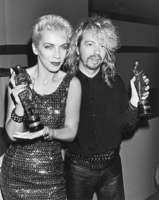 As Eurythmics, Stewart and Lennox became one of the Eighties' biggest acts, engulfing the planet with a stream of hits including "Sweet Dreams (Are Made of This)", "Who's That Girl", "Would I Lie To You" and many more, with blockbuster albums to match. Since the duo dissolved in 1990, Stewart has kept busy with a broad variety of projects. He has worked as a producer with Tom Petty, Mick Jagger, Bryan Ferry and Stevie Nicks, he has made solo albums, and was one of the guiding lights behind the 46664 campaign endorsed by Nelson Mandela, in which a roll-call of megastars battled HIV/Aids in South Africa (Stewart and Lennox collect yet more Eurythmics gongs, pictured below).