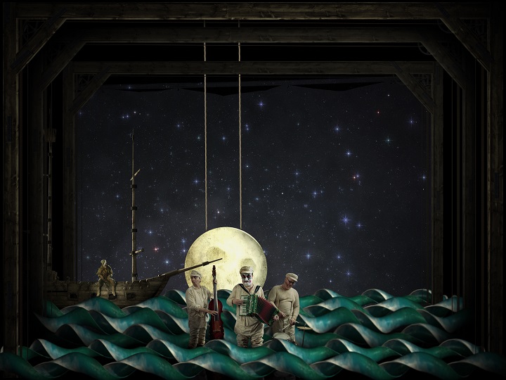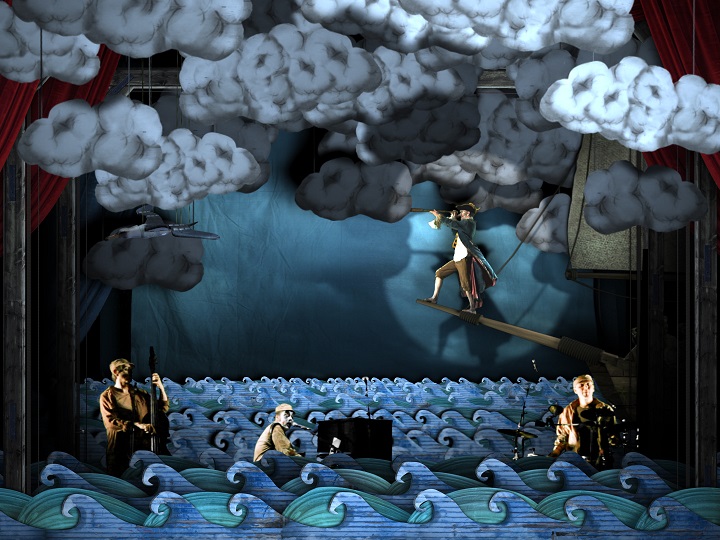 Visual associations come from all over the place. Given the marine subject matter, it could be a monumental fish tank, or a Punch and Judy box on a Victorian pier, caught through the prism of Terry Gilliam. Though Holthausen has mentioned associations with baroque, there’s a strongly Victorian feel, with the mannered stagings of music hall, from the stylised waves that lap stage front to the albatross itself. Audiences will marvel at how it’s all achieved: there’s at least one layer of front stage projection, and multiple rear projections which create a deeper sense of backdrop, and a collage effect. There’s both stop-motion and live action animation, and effects that could be drawn from older traditions, like Indonesia's wayang, in the elaborately flounced mermaids who periodically swim before us.