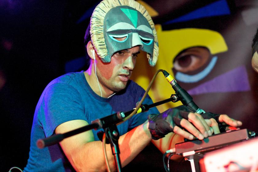 The psychedelic spell was broken when the curtain came up and Jerome spoke to the audience in oddly showbiz tones, thanking us for coming, saying how nice it was to be back in his hometown and so forth. The dissonance of such prosaic, if heartfelt, sentiments coming from behind a tribal mask was distinctly odd, but very quickly the duo started playing and the sweaty atmosphere returned – on stage and on the ground floor of the multi-tiered Koko which became a busy dancefloor.