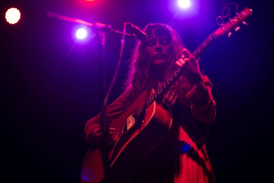 Headliner, Emma Ruth Rundle wandered on stage alone, dressed in a long black dress and a translucent white jacket, armed just with an acoustic guitar and a carpet of peddles to revisit her Some Heavy Ocean album and a few other choice offerings from the last 10 years or so. Sparse grungy guitar and plaintive, semi-heard vocals soaked in reverb gave Rundle’s set a distinctly Gothic-folk vibe that was heavy on atmosphere but not over-powering. “The Distance” was particularly dark and foreboding with projections of corn fields behind the stage, while “Darkhorse” was breathy with Rundle’s slurred vocals sending out a warning of “Run little sister. Run so fast” against the backdrop of a bubbling stream.