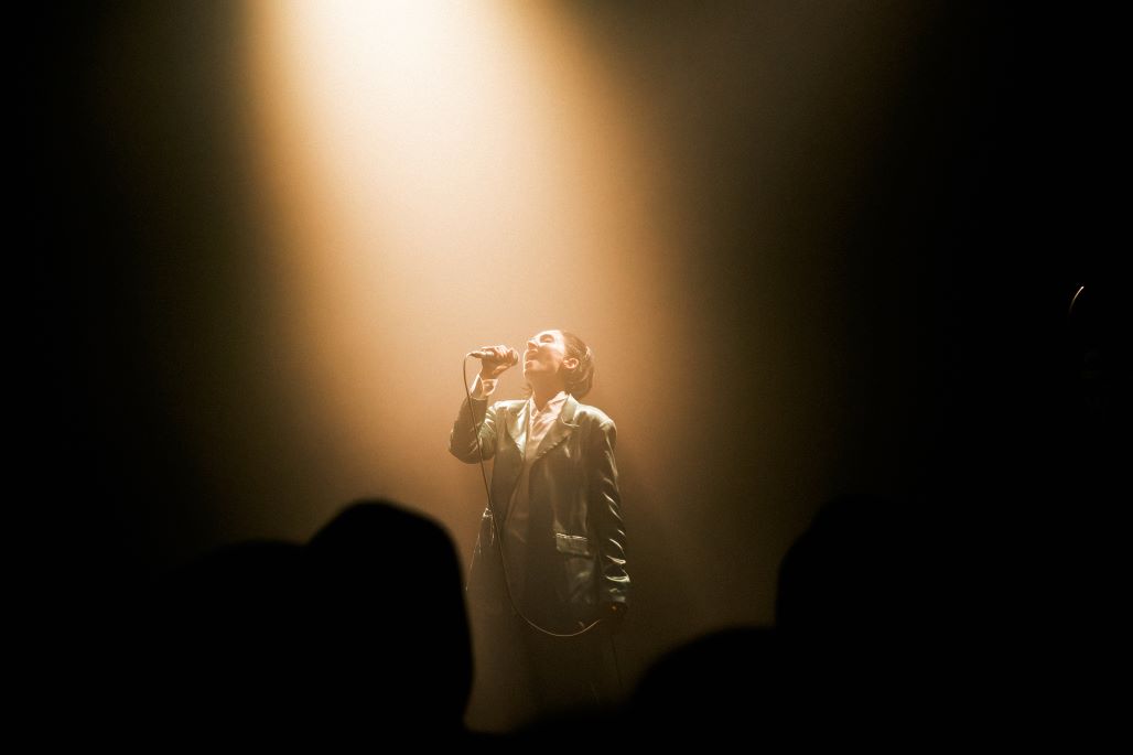 The first day of Supersonic 2024 hit the ground running with the woozy fever dream of Gazelle Twin’s (pictured below by Robert Barrett) latest production, Black Dog. Largely performed from and around an armchair and standard lamp, surrounded by various pedals, switches and buttons, Elizabeth Bernholz held court dressed in a shiny green baggy trouser suit with shoulder pads, rather than as the mischievous sprite from her last visit to Supersonic. Her Electro-Goth art performance emerged from horror movie soundtrack territory, with slow and occasionally meandering, grinding industrial grooves accompanied by whispers and growls that often had a strange Victorian nursery rhyme quality.