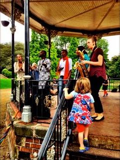 Far more radical than the shows themselves were what became known as the "pop ups", which were small impromptu gigs that took place on station platforms, in shopping centres, schools, hospitals, record shops, community centres and parks (pictured left, Tamar Osborn [Express Horns], Bintou Soumbounou and Fatim Kouyate [Rokia Traore's band], MC M.anifest and Rokia Traore on the bandstand in Hanley Park, Stoke-on-Trent.) Punters buying records at Spillers in Cardiff were flabbergasted to see the infamous but equally hilarious and lovable Carl Barat of Libertines fame stroll into their midst with various African instrumentalists in tow and play an short set. Carers and patients at a centre for the severely disabled in Bristol were quite gobsmacked when Damon Albarn turned up to sing a few tunes and talk about the strife in Mali. Hardly anyone showed to see Jupiter and Okwess International when they played at Middlesborough Football Stadium. But it hardly mattered. Okwess were the vibemasters of the tour par excellence, conjuring up magic on drab station platforms to the delight of the travelling public.