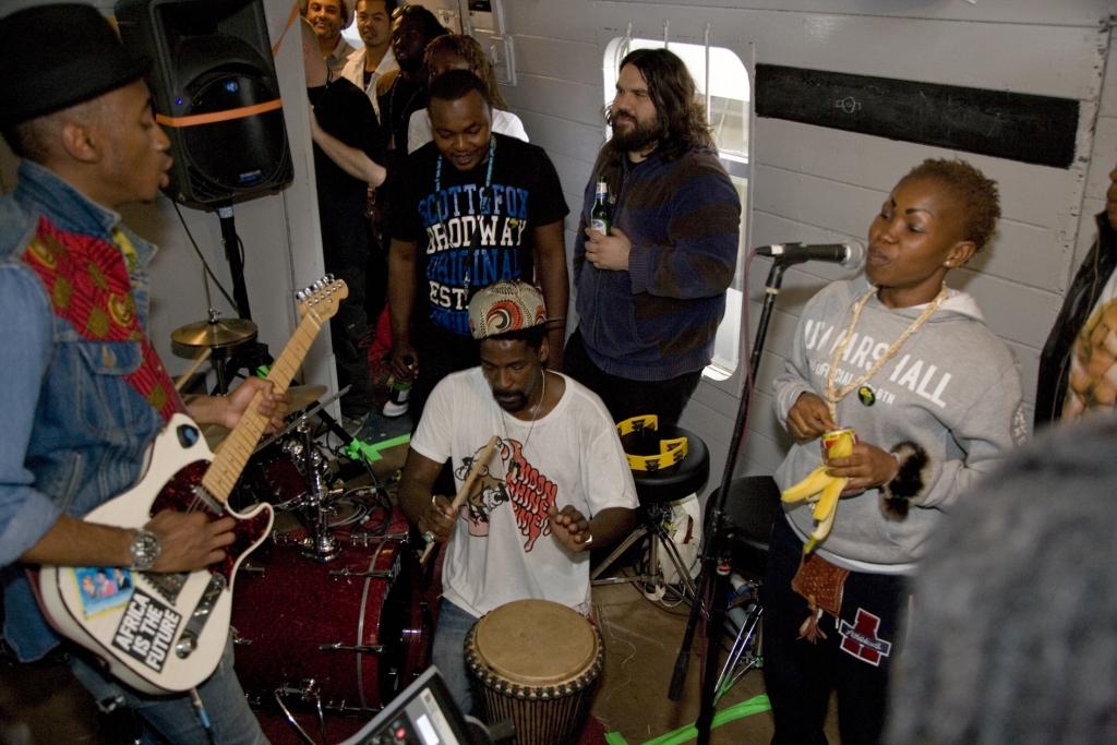 Next was the rehearsal carriage, always full of swaying musicians kicking out the jams and ignoring the loud rush of rails beneath their feet. Sometimes the place was so packed you couldn’t walk through it; M.anifest or M1 from Dead Prez might be laying down a rap over a rhythm provided by bassist Yao from Amadou & Mariam’s band and Cubain, the tall steady-eyed percussionist with Okwess international. Damon might be there with his melodica, standing next to Richard Russell, boss of XL Recordings, producing all kinds of electronic bleeps and rhythms from assorted machines. The wonderful singer Nelly from Okwess might be sharing a mic with Martina Topley-Bird or Genet Asseta, the ever-smiling lead vocalist of the Krar Collective. And mind you don’t trip over Romeo Stodart from the Magic Numbers, as he adds melodic licks to the rolling rhythms. It was almost impossible to pass the rehearsal wagon without stopping for a moment and enjoying the music.