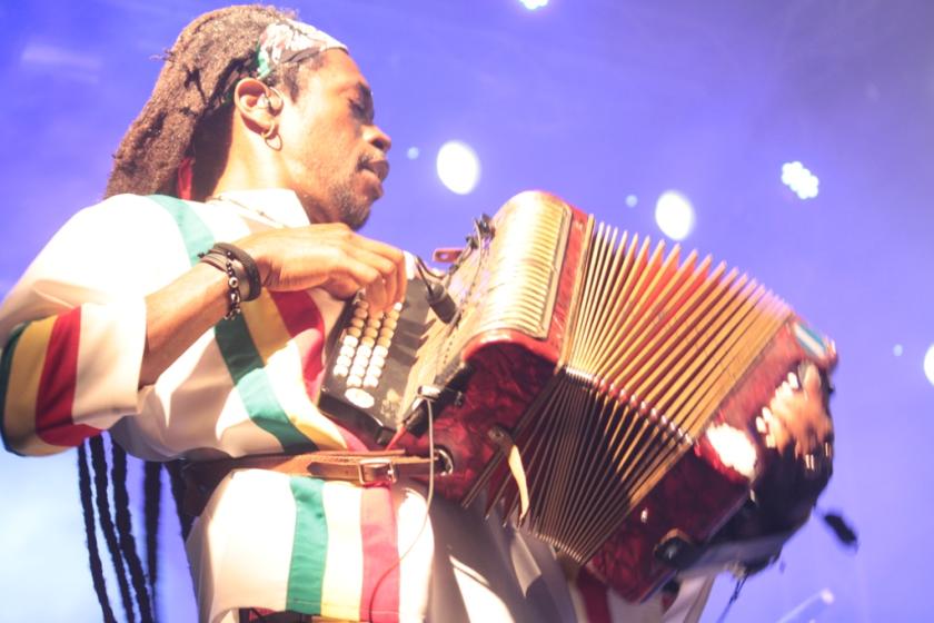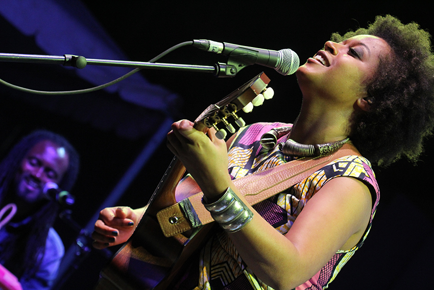 On my first proper night in Praia, the capital of the island of Santiago, I saw a much more upbeat local group, Ferro Gaita, at the Atlantic Music Expo (AME), which is an off-shoot of WOMEX, the annual assembly of world music professionals. AME is more focused on transatlantic music, and is in its second year. The name Ferro Gaita is derived from the ferrinha, the metal bar they use as percussion and the gaita, the accordion, brought in by missionaries. Their style is funana – a much more rhythmic, African style that really rocks, not dissimilar to Zydeco music. Funana was banned until as late as 1975 for its subversive lyrics. (Pictured below right, Sara Tavares. Photo by Jean Berry)