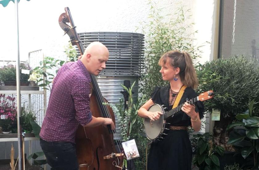 Stretching south along Brüsseler Str., the surrounding area embraces the upbeat spirit. Squished against the shelves of the bookshop Stiebter Himmel and hemmed in by keyboards and pedals, Dissolver is a one-man Medicine. The clothes shop Blutsgeschwister is hosting Soeckers, a sort-of Arctic Monkeys. Best of all, and taking it back to the Stadtgarten terrace’s bucolia, outside a market hall the local but half-New Zealand bluegrass-influenced duo Stereo Naked sing off-the-wall songs of road kill and thwarted ambition amongst a flower stand’s plants.