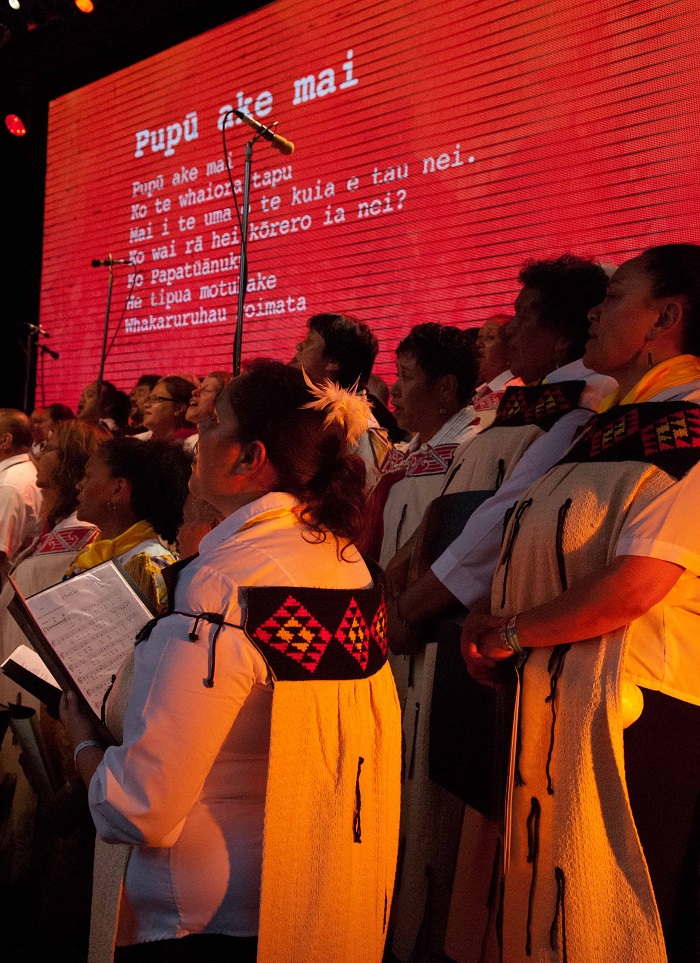 Mihirangi is a rising local star who sings in Maori over loops and imaginative percussion workouts. She blends rap and R&B with Maori chants to create a pop groove that is both impressive if limited by the loops’ inability to allow any breathing space. The biggest event of the weekend found 80-strong Aotearoa National Maori Choir (pictured left) taking the main stage. They were joined by contemporary band The Yoots (pictured top) - an offshoot of Fat Freddy's Drop, the hugely popular Kiwi soul-dub band - for a huge singalong of Maori song. The Yoots have recorded an album of ska-flavoured versions of Maori songs and as they played these (wild trombone solos and fat organ colouring the tunes) the National Maori Choir sang with magnificent gusto.