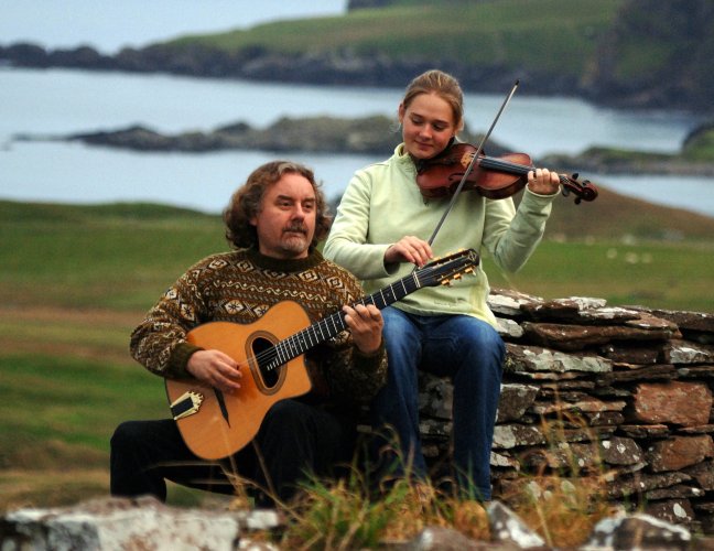 There are mandolins, fiddles and ukuleles for sale in Brian Nicholson’s high street music shop, and most nights all ages are whooping it up in a pub with music (Nicholson pictured right with Maggie Adamson). “We didn’t get electricity till 1968,” Nicholson tells me. “We didn’t have TV or anything. So we sang, under paraffin lamps, oil lamps, or gas lamps. I think our generation who grew up without electricity are more rounded human beings. We can entertain ourselves.” These days Shetland children get free music lessons and free instruments in schools, and there is no shortage of role models to teach them. “ It’s very important for everything about you, your language, dialect, culture, your music, all that stuff is made more intense when you know it’s also what your grandfather would have made, the songs he would have sung, or stories he would have told. It kind of fastens you to a spot, gives you a pride in who you are and where you come from. It’s part of being rooted, the sense of having a place in this world. That’s what we all want is a place in this world.”