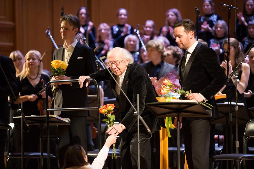 But, what a perfect hall the Great Hall of the Moscow Conservatory is in which to give such a performance. Packed to the rafters, its acoustic remained flawless as the bells of St Mark’s rang out, the gondolas bobbed up and down and the beach hosted the percussive gyrations of the young Polish boy and his rivals. So masterful is Britten’s creation that somehow the lack of any dramatic staging only heightened the imagery that abounds in every page. Gennady let the music roll out almost by itself, offering the occasional cue to a lone bassoon or errant hotel porter. It made for a long first half. I was amused to have heard two things in the interval. First, a woman had been seen leaving with a downcast face, ‘this is even worse than Shostakovich!” and second, upon commenting on the pacing of the opening act a suggestion was offered that perhaps the older one gets the less likely one is to conduct with direction towards to the end, whatever that end should be. Pictured below, Rozhdestvensky holds the score aloft at the end of the concert.