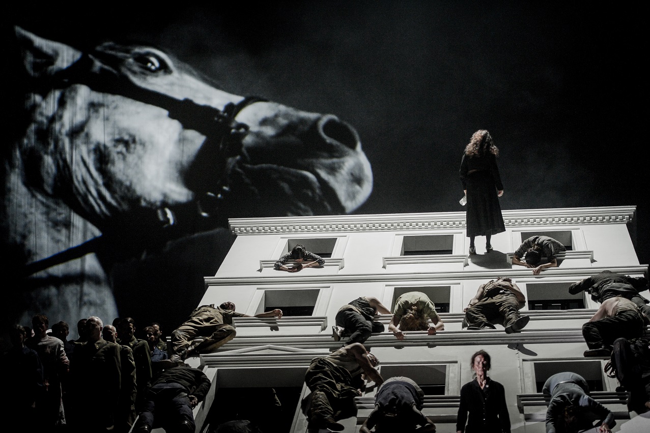 Bieito explains that the civil war setting offers a parallel to the central family drama of the opera: the Vargas family torn apart through their incapability for reconciliation. As in civil war, the enemy is within. Visually, the setting takes on a greying monochrome, partly referencing newsreel footage, but also Picasso’s Guernica, and at one point the image of a startled horse is projected against the backdrop to make that connection explicit. One area that doesn’t lend itself to subtlety is the evocation of fascism, and the first two acts are weighed down with oppressive back projections of goose-stepping soldiers and giant jackboots. There is also a book-burning, or at least tearing-up, scene in the second act that seems heavy-handed. But the civil war angle works, especially for the specific context it provides for the ill-defined wartime setting of the libretto.