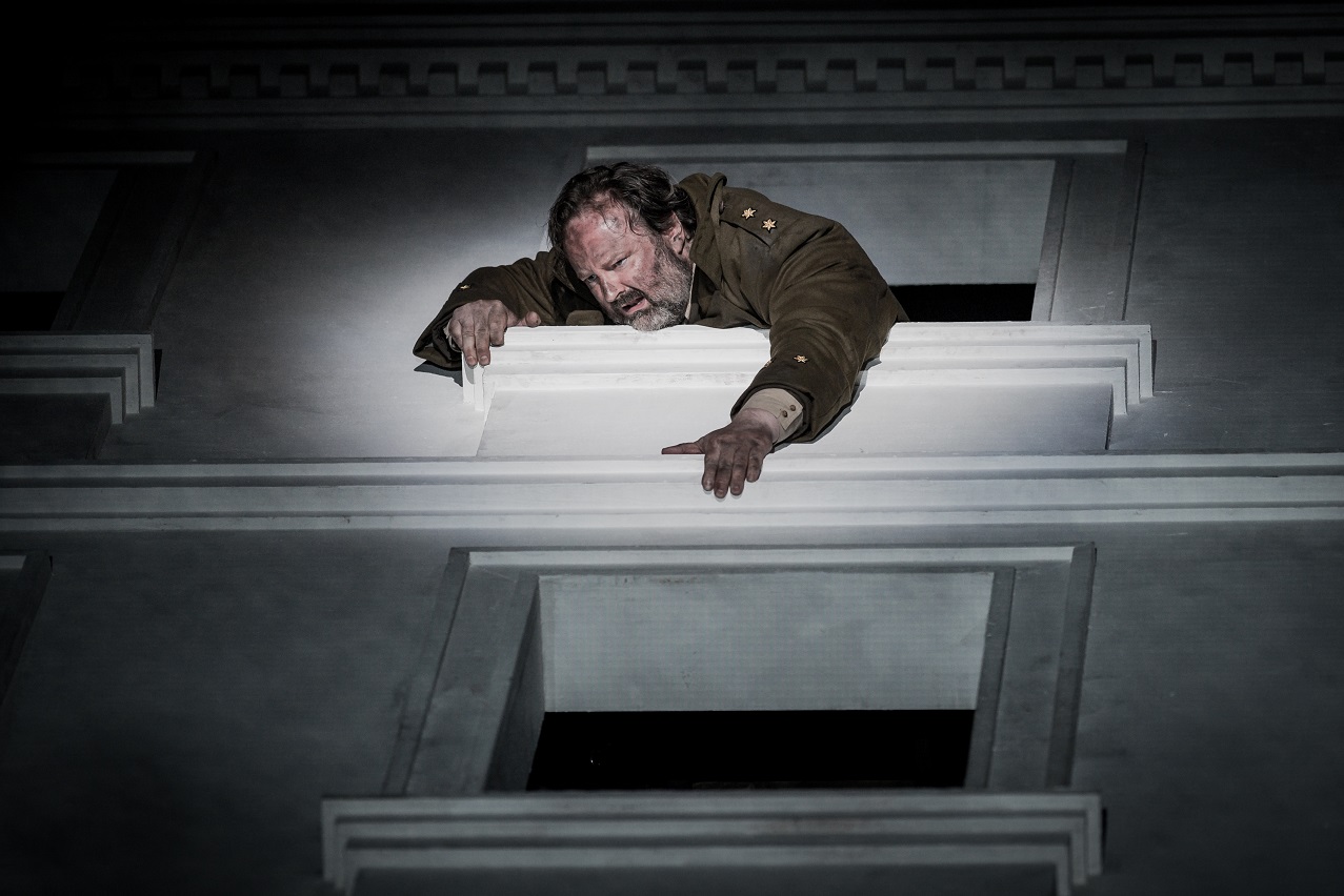 Three-storey terraced buildings dominate the stage throughout, two-dimensional facades, each supported behind by a small scaffold. The backs become as visible as the fronts, as each is moved around and, at one point, all are set in continuous rotation on the revolving stage. None of this adds much to the drama; the facades are set at oblique angles to convey the trauma of the fourth act, but are otherwise left to their own devices. They make for ambiguous scenarios, none of which do more than suggest the settings, but the abstraction allows the drama to take place on a more physiological level, its contexts more imagined than defined.