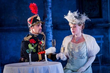 It’s a work which reminds us that French operetta and opéra comique often cross the boundaries supposedly defined by those titles. It starts off apparently as an operetta. A lawyer’s clerk, Landry (Tristan Stocks) tunefully extols the youthful charms of his elderly boss’s wife, Jacqueline, then introduces her to a green youth (Fortunio) recently up from the country; though generally regarded as pure and untouchable, she is quickly seduced by a ludicrous captain of dragoons called Clavaroche (Quirijn de Lang), who is next seen tumbling out of her wardrobe where he’s been hiding from her jealous husband (Timothy Dawkins). (Pictured: Quirijn De Lang as Clavaroche and Ilona Domnich as Jacqueline).