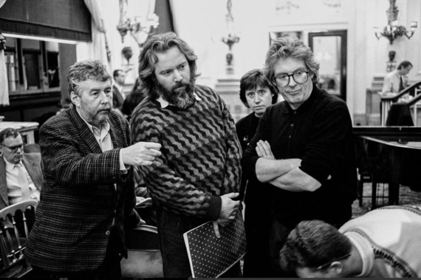 Harrison Birtwistle, John Tomlinson, designer Alison Chitty and librettist David Harsent during discussions about 'Gawain', 1991