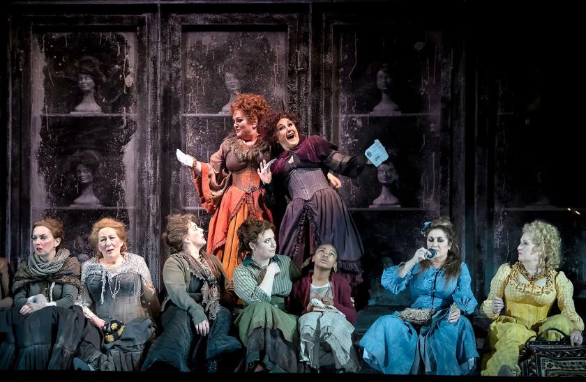 Of her senior companions, only Josephine Barstow overdoes the already melodramatic role of the grandmother whose soaking in vice from an early age has destroyed her moral compass. The top notes are still splendid in a rant which sounds like Vaughan Williams on acid, the middle range a bit swamped. Susan Bullock and Lesley Garrett burst on to the scene as tipsy light relief; their initial duet is about as funny as Claude-Michel Schönberg’s dreadful number for the Thénardiers in the musical Les Misérables.(consult Sondheim, please, Iain Bell). But they do it as well as they can, and Bullock (pictured below in the final scene) has perhaps the most consistently successful stretch in the opera at the start of Act Two, one of the few that really makes the flesh creep, when the comedy of her rapture about a strapping fireman is offset by the ballad of “five little trollops” (shame about the "And then there were none" "thriller" aspect of the opera, though). She sounds in perfect voice, as do Kelly and the ever-sympathetic Marie McLaughlin as victims one and two. The quintet for the five main characters is successful, too.