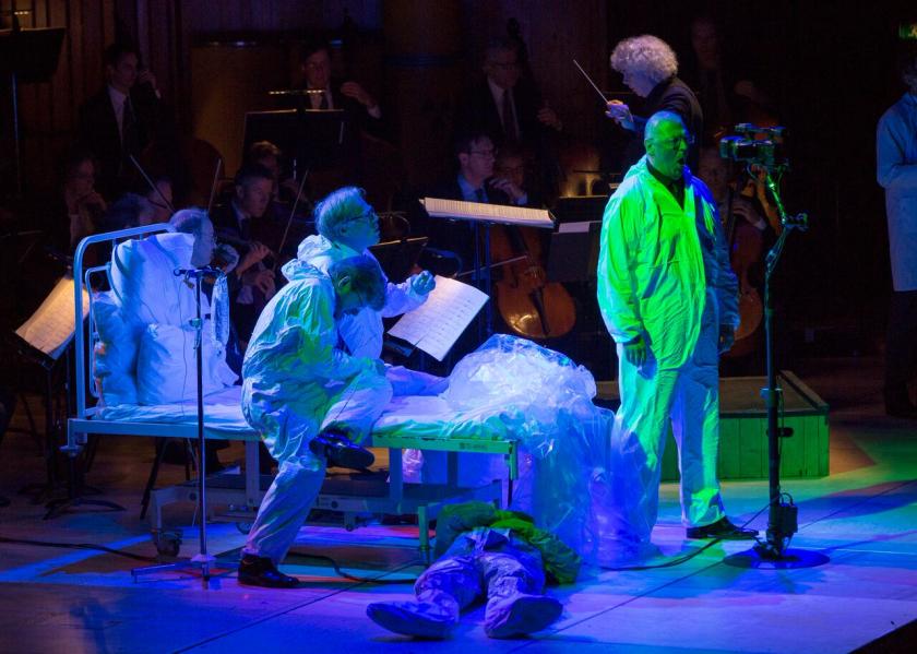 So while we puzzle out what's going on with the folk in white coats, starting out at a Nuclear Energy seminar and clearly, some of them, suffering from radiation, true meaning and gesture should be found in the London Symphony Orchestra under Rattle. They do indeed run the full gamut of Ligeti's sound cornucopia, from the familiar chord-clusters to the florid polyphonies (I've never noticed, for instance, the crowings of Rameau's hen – brilliantly taken by piccolo clarinettist Chi-Yu Mo – as strings revolve a Bourée perpetuelle to which Nekrotzar screws the jaded, sado-masochistic Astrologer's wife Mescalina to death (pictured below, Heidi Melton dragged along by Frode Olsen and Peter Hoare).