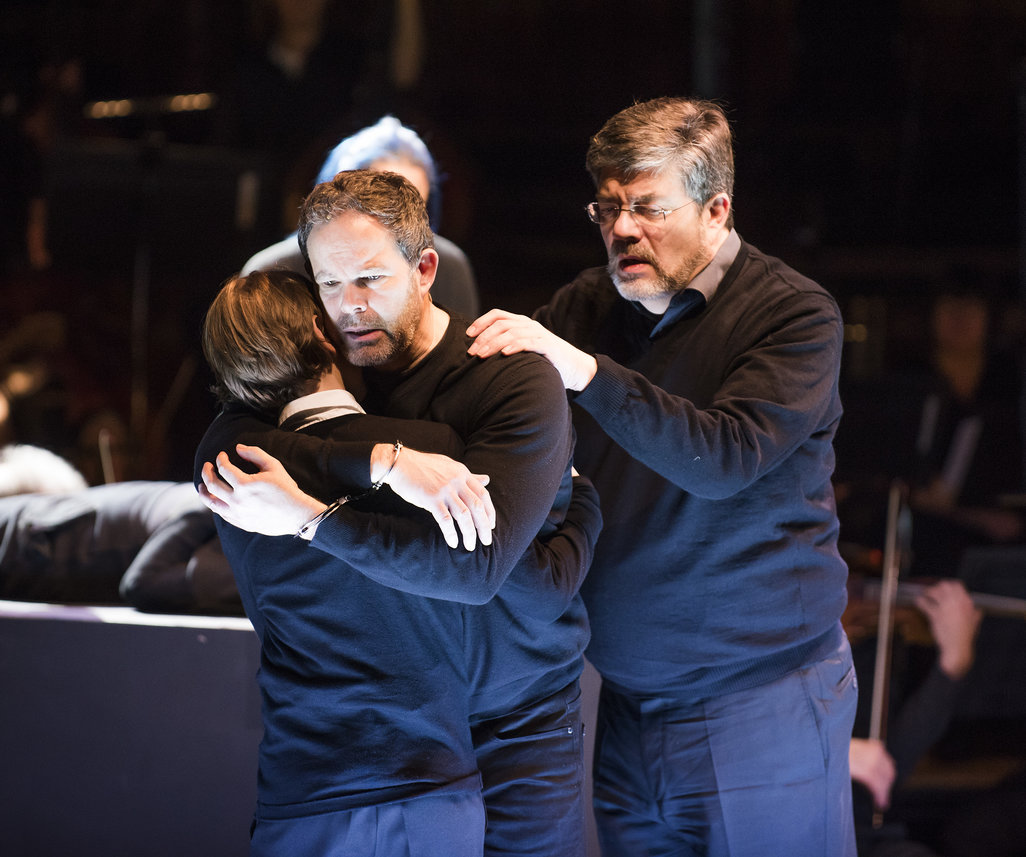 What’s most striking is the reaction of a director whose language is physical symbol, ordered, ritualised gesture, to a drama whose own symbols are already so clearly defined. Aided by an exceptional cast, Sellars’s style softens into a stylised naturalism, finding the human as well as the humane in the story. Even with the clutter of a symphony orchestra on stage, you’re always aware of Gerald Finley’s Golaud (pictured above with Elias Madler and Franz-Josef Selig). His hunting doesn’t stop at the end of the opening scene, but continues throughout as he stalks and prowls, dangerously obsessed with Magdalena Kožená’s Mélisande. This confusion of tenderness and violence is mirrored vocally. Such patrician smoothness and control, such tonal beauty becomes grotesque when allied to the bullying of his son (the astonishingly mature Elias Madler) or his physical abuse of his wife.