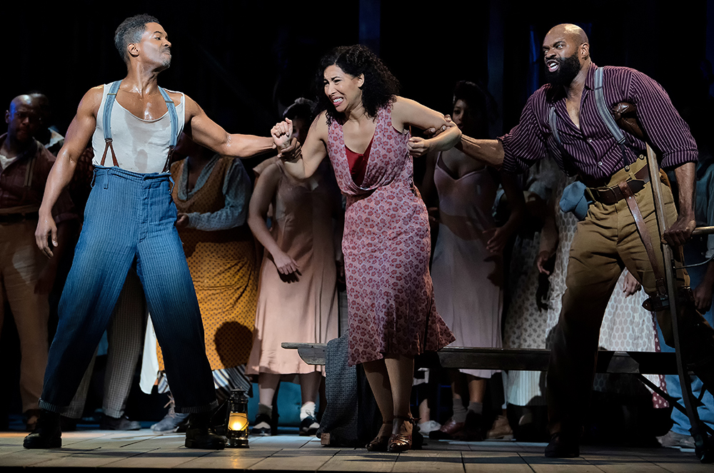 This cast, though, shows terrific strength in depth. From Latonia Moore’s commanding gospel fervour as Serena to Donovan Singletary’s smoothly forceful Jake, Catfish Row emerged as a slum crammed with stars. It’s worth pointing out that South African singers took no fewer than five character parts, and they all excelled – whether Nozuko Teto’s strawberry seller or Njabulo Madlala’s Jim. At times, this almost felt like a Cape Town Opera benefit night. Their welcome presence proved again what an extraordinary nursery for the whole world of music theatre has developed at the tip of Africa. Meanwhile, Bess’s twin plagues, and twin tempters – the wheedling pusher Sporting Life, and the abusive thug Crown – strutted their stuff in a chilling double dose of what Gershwin probably never called toxic masculinity. Frederick Ballentine and Nmon Ford (as a horribly charismatic Crown) deserved all their mixed cheer-boos at the close. (Pictured above: Nicole Cabell with Nmon Ford and Eric Greene)