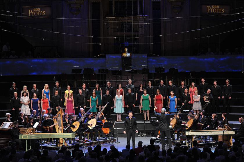 Gardiner and his forces have previous form; their 2012 Monteverdi Vespers at the Proms exploited every acoustic and spatial possibility of the Royal Albert Hall, and here once again their semi-staging inhabited the entire interior. The Messenger entered from among the Prommers, complete with accompanying Theorbo player, Gods descended from above, while echoes called back to Orpheus from the balcony. Even the ensemble weren’t confined to their seats, standing for a triumphant opening Toccata, brass roaming about to catch the acoustic.