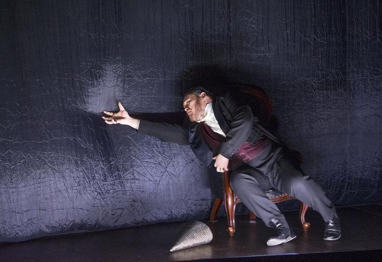 A Mrs Rochester-esque woman (later revealed as Monterone’s daughter) darts wildly around the room in her petticoat – the mad woman in Victorian art’s attic let out to play. Sprawled across a sofa among all the suited male figures, she also bears more than a passing resemblance to André Brouillet’s notorious painting Une leçon clinique à la Salpêtrière, in which a young women slumps half-dressed, a human teaching aid in a room of medical students. It’s unfortunate that Stephen Langridge’s I Puritani at Grange Park has so recently mined this particular seam for effect, perhaps dulling me to Alden’s careful blurring of public and private, his claustrophic collapse of Rigoletto’s world and the Duke’s kingdom into a single room, always filled with observers.