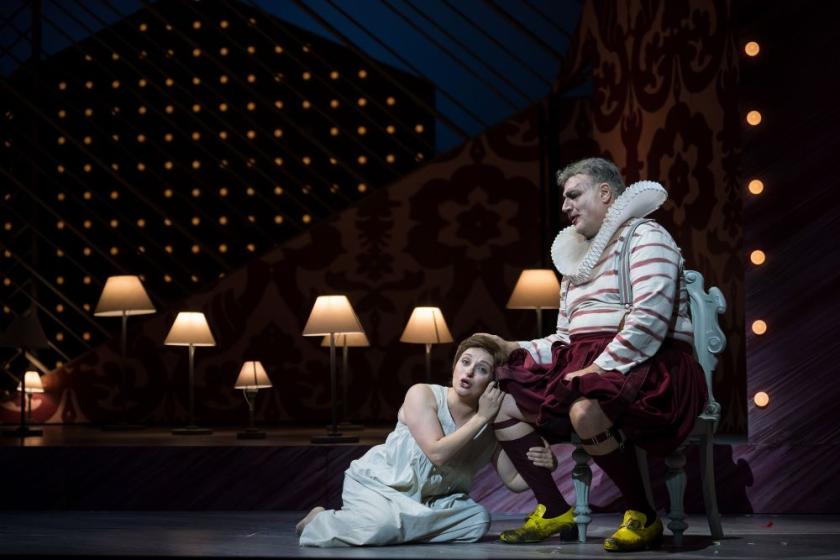 Those are partially solved by the symmetrical appearances of two rooms towards the front of the stage – Rigoletto's gilded cage for his daughter Gilda on the left, later Sparafucile's inn on the right, candles atmospherically replacing the multiple palace lamps of Act Two. None of this is realistic, so maybe one shouldn't make the usual quibbles about too much light to show Rigoletto where he is, or a supposedly safe house the front door of which opens so readily to strangers. I could have done without the bits of jester face carried around during the Prelude, though the head in lights at the end is powerful: the jester's show going beyond his plans, and a disconcerting alternative to the usual bare banks of the river Mincio after a storm.