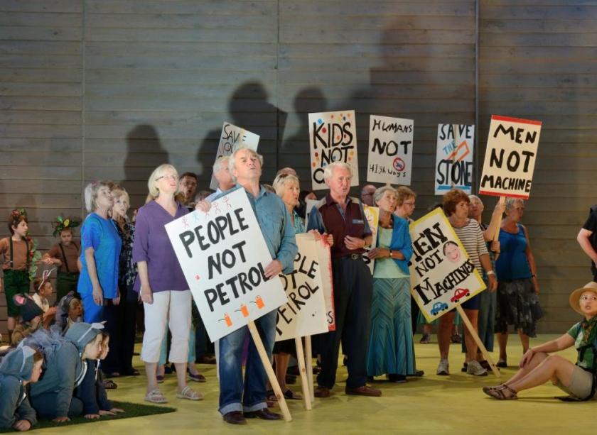 The fact these sly, know-all advisors are teenagers, and musically very competent ones – these suave youngsters were easily the show’s best singers and characters - renders them as bolshie as the protestors they are confronting. There are three more "professional" roles: a girl crowd-raiser (Clare Presland, aptly tub-thumping and vocally zappy), a rather under-characterised Surveyor (Alexander Byron Hargreaves) and quite a high decibel, robust Activist (Peter Willcock). Some of the best adult soli came from the amateur chorus: several baritones furnished a very presentable vocal match for the full-timers.