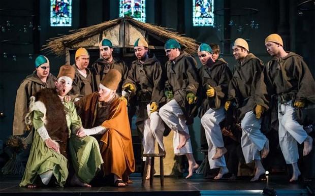 Here was a cast - led by the visually, as well as vocally, gifted tenor James Gilchrist - of young men (monks headed by a superlative bass Abbot, Lukas Jakobski), and boys, cowled novices who yield a brilliant floorshow, wiggling hands, legs and pelvises teasing out shockingly sensual shapes and gyrations. Kitty Callister’s furnace design (a layered series of stained glass shards) made a dazzling, breathtakingly apt climax. Ben Payne lights often from below, alternating eerily sinister and beauteous effects.