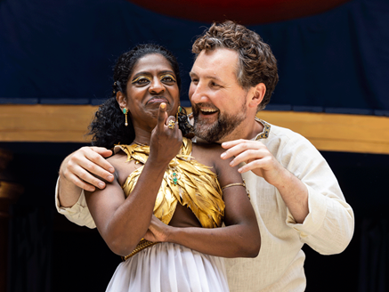 John Hollingworth as Antony has the physique for the role, and grows considerably in stature as the play proceeds, approaching a final grandeur. But the imbalance between the title characters at the opening remains firmly in Cleopatra’s favour. How could it be otherwise, when her performance’s sheer seductive magic, her camp (in Susan Sontag’s interpretation, “a sensibility that revels in artifice, stylisation, theatricalisation, irony, playfulness, and exaggeration rather than content”) is so alluring? Her attendants, led by Zoë McWhinney’s Charmian, and supporting players, like Nadeem Islam as the ill-fated messenger, and William Grint as the Soothsayer, are similarly expressive (pictured above).