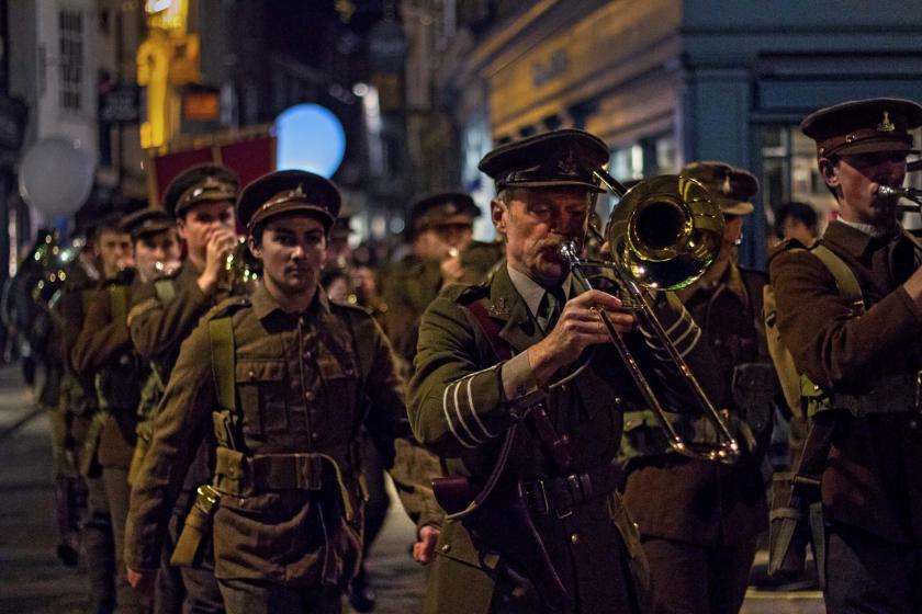 Couples and families huddled closer in those final moments – and not entirely because it was 9.30pm on an October night. The past-present juxtaposition on the city-wide stage made this tale of human love, loss, strength and weakness in times of war particularly heart-wrenching. It was touching simply to observe these wartime friends, lovers and dreamers line the same streets as their bemused real-life counterparts who, standing by at cashpoints and outside pubs, might easily have been part of the lost generation themselves - although, on the night, they might have been forgiven for confusing some of the actors for freshers in fancy dress. (Picture above right by James Drury)