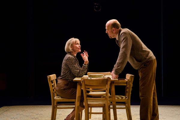 All this and more is brought out in David Mercatali’s precise and exciting revival, an Orange Tree co-production with Bristol’s Tobacco Factory Theatres. On Angela Davis’s minimalist set, his cast rise to the challenge of a fiendishly difficult text, whose rapid reversals and sudden changes of pace must be a monster to learn. Andy De La Tour (pictured above) is a convincingly angry Brian whose cannibalistic monologue is a tour de force (no pun intended), while Amelda Brown’s sensible Alice (pictured with De La Tour, above) and Amanda Boxer’s scatty Maisie are perfect foils. In the second half of the 95-minute double bill, Alex Beckett’s malicious Derek dominates the women in his life. Together with the other cast members they make this an event that is both playful and genre-busting, excruciating and exhilarating, alarming and truthful.