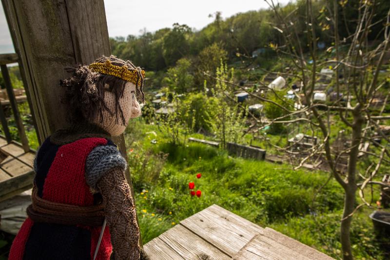 The last hour of the piece is spent in a free wander around the allotments, where participating gardeners play host to doll versions of Shakespeare characters, knitted in witty detail by Annie Hardy. Ophelia sits by a pond. Falstaff is propped up in a picnic chair, his drunkard’s nose meticulously mottled in wool. Bottom lounges by a cluster of Forget-me-nots. One gardener pops out of her shed to show us what’s under Macbeth’s kilt.