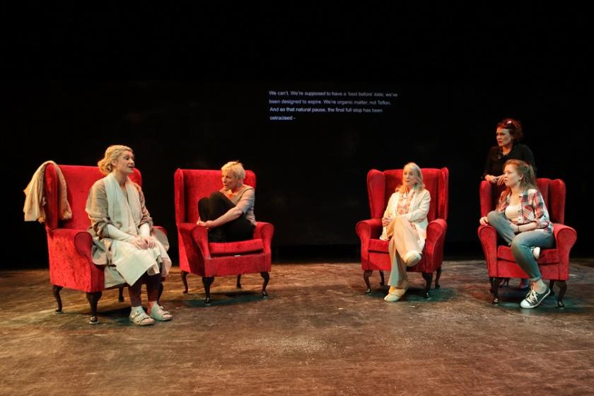 And on Phillip Zarrilli’s set with 10 crimson wing-backed chairs, the big themes are discussed: the sanctity of life, the mechanics as well as the morality of suicide, the aging process, femininity, feminism (and it is not so much that men have no part to play on this stage, but rather this is a world without them – their only function is to pass on life, and to pass on death, from way back in the wings).