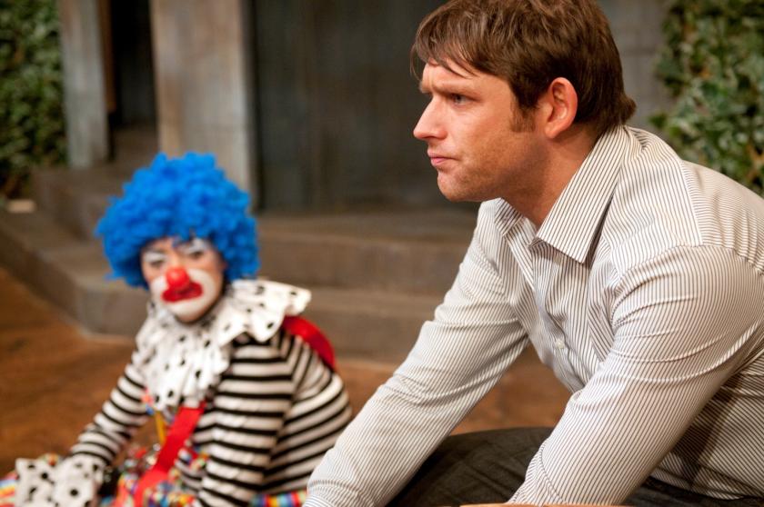 Charlie’s wife, Linzi (Emma Swain), was on the telly when they married and is now missing fame as she stays at home to look after their children ("Now I'm just Mrs Charlie Conrad"). She's bored with their life and matters come to a head at their young son’s ridiculously over-the-top birthday party where Marsha (Helen Mortimer), a clown who describes herself as Charlie’s greatest fan, has been hired to entertain the dozens of children invited. An aggressive journalist, Gale Gilchrist (a fine turn by Siobhan Hewlett), is also at the house to interview the famously squeaky clean Charlie. Ayckbourn takes a rather long time setting up the play’s pivotal point (and Retallack’s direction could be snappier) as Marsha accuses Charlie of sexual assault after they are caught in flagrante by Gale, Linzi and Jason.
