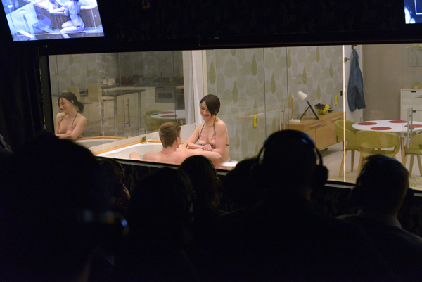 Once inside, we are each given a set of headphones and seated on benches, which are arranged on the four sides of a newly built house somewhere near Liverpool. In front of every block of spectators is a rectangular blind, and three small CCTV screens. Are you ready? Let Game begin. The blinds rise, and we find ourselves peering through the “fourth wall” into the living room, kitchen, bedroom and bathroom of the home of a young couple, Ashley and Carly. As in Big Brother, we can see and hear everything. Just.