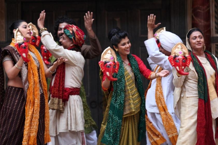 Indeed, the women were granted a pride of place not often found in English-language stagings of this play, Nishi Doshi's Alkini a far more robust figure than Shakespeare's equivalent Diana. Given her own song with which to woo the crowd, Alkini became Heli's genuine ally, not just a plot device on the way to meeting the conditions that will force Bharatram's hand by play's end. And I loved the vigour of Utkarsh Mazumdar's Gokuldas, here not the King of France but a sharp-eyed merchant prince whom Heli cured of tuberculosis in a delicious scene in which Mazumdar circled the stage with gathering energy while Heli fueled him with pills. This same character, we have been told to sizeable laughs from the crowd, didn't think much of English medicine. Not, I would imagine, that he needed it, given the entirely curative tonic that was this show.