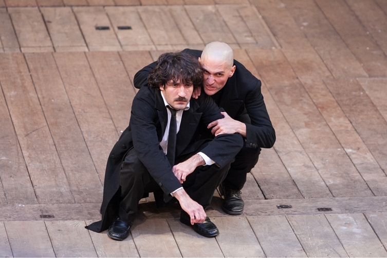 Caesar himself is always referred to but not seen. The three conspirators semaphore his murder by drawing striples in red chalk on an old leather chair. Again, fine in itself, but the remaining characters are marooned without his essential presence. Baracco’s direction has whittled the action down to a series of neurasthenic clashes between half a dozen lead characters. Their stage mannerisms are defiantly “radical”. There was unexplained writhing from Ersilia Lombardo’s barren Calpurnia and Liva Castiglioni’s Porzia, whose presence on stage can otherwise scarcely be justified. From the men there were jerky marionette steps. Roberto Manzio’s Cassio, a squeaky-voiced petulant psychopath from a Seventies cheapo horror film was particularly grating. Giandomenico Cupaiuolo’s Bruto (pictured above right with Manzio) was driven to maddening torment as if by numbers. Lucas Waldem Zanforlini’s Casca (and briefly, Ottaviano) and Gabriele Portoghese’s alcoholic Marc’Antonio looned around the stage as if an early Eighties pop video.