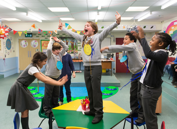 Vicky Featherstone’s lively production features a cast of bright young boys and girls, led on press night by Nancy Allsop as Louie (pictured above on table). But these boisterous kids are only part of the show. The adults in the show are familiar faces such as Amanda Abbington (Sherlock and Mr Selfridge), Julie Hesmondhalgh (Coronation Street) and Nikki Amuka-Bird (Small Island). Abbington’s Sali Rayner is relentlessly upbeat and contrasts nicely with Amuka-Bird’s Ms Evitt and Ony Uhiara’s Ms Newsome, with Hesmondhalgh as the down-to-earth Mrs Bradley.