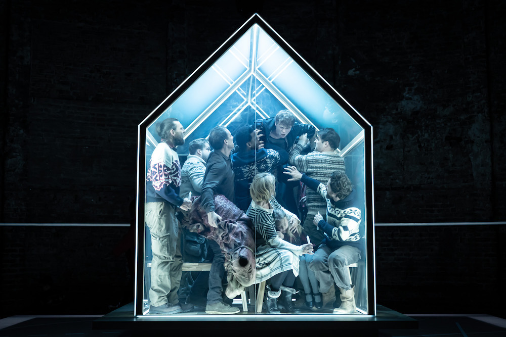 Like the original film, Farr's storytelling emphasizes the fact that Lucas is innocent from the beginning and thus deprives the story of any ambiguity, and it's odd that Lucas doesn't tell his accusers what actually happened with Clara until the second half of the play. But if you accept this, then the piece's tension does rise and designer Es Devlin's square wooden stage is dominated by an expressionistic glass shed (pictured above) which reflects light and whose claustrophobic interior can effectively be a cold school room, a hot lodge or a crowded church. This intensity is increased by Adam Cork's music, which gives the male bonding scenes a genuinely frightening fierceness.