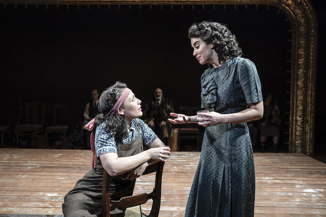 There is a lot of material to cover in this story, as Asch takes the script to Berlin where it is hailed as a sensation, then on a whirlwind tour to cities including St Petersburg, Bratislava and Constantinople. Each destination is identified through surtitles on the backdrop, while the cast shift round the stage, repeatedly performing the final dramatic lines to increasing hilarity. At the emotional heart of the play is the moment when the prostitute and the virginal brothel-owner’s daughter kiss in the rain, compared by both Vogel and Taichman to the balcony scene in Romeo and Juliet. Like all the cast, Molly Osborne and Alexandra Silber (pictured above) play a range of characters in the production, but as the lovers they manage to convey a genuine heartfelt connection.