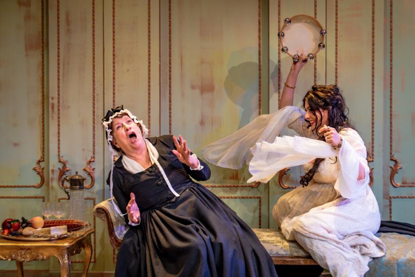 Rose Quentin (pictured above with Caroline Quentin) is our heroine, all witty remarks, tousled hair and heaving bosoms, but she also captures the fragility that clings to a self-made (more accurately, self-imagined) woman in a man’s world. She butts up against her mother (her real life mother too, Caroline Quentin) partly because the charades that work so well in palaces and bedchambers seldom survive the truths that pass between a parent and a child. The pair throw out barbs aplenty, but they love each other, and are very funny about it. Quentin junior has inherited the comic timing gene, and one can only congratulate the director, Michael Oakley, on making good on such an inspired piece of casting.