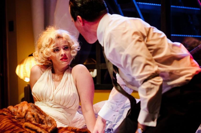 However, where Johnson uses the contrasting luminaries as a springboard for debate, Mercatali's production remains too much in thrall to the personalities themselves, Simon Rouse's thoughtful and understated Einstein aside. Alice Bailey Johnson (pictured top with Rouse and directly above with Hembrough) too often stifles Monroe beneath a breathless facade, while Tom Mannion's overly amiable McCarthy lacks conviction and Oliver Hembrough's sportsman, DiMaggio, rarely changes gears. At the centre of it all, the superb Rouse watches and listens, grounding the action and providing a welcome counterpoint to performances overwhelmed by the weight of impersonation, however coyly Johnson's text refers to the quartet simply as "The Professor" or "The Actress".