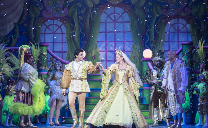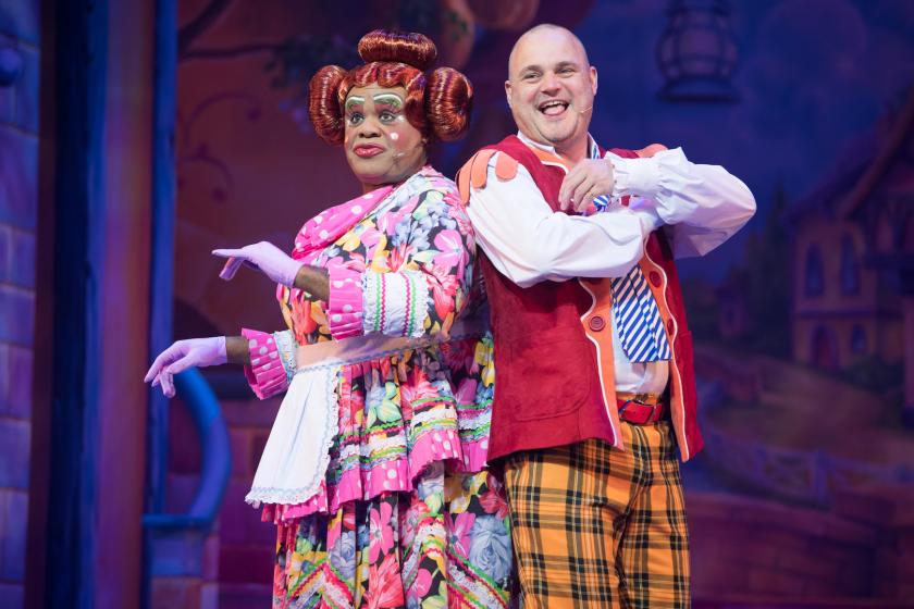 Giving so much stage time to Murray means that much of traditional panto has been lost, and the relationship between Jack and Princess Apricot (Liam Tamne and Charlotte Gooch, pictured above) is rushed. Their scenes together are sweet and tuneful, but the central narrative, being truncated, is confusing if one doesn't know the story in detail (as perhaps young ones may not).