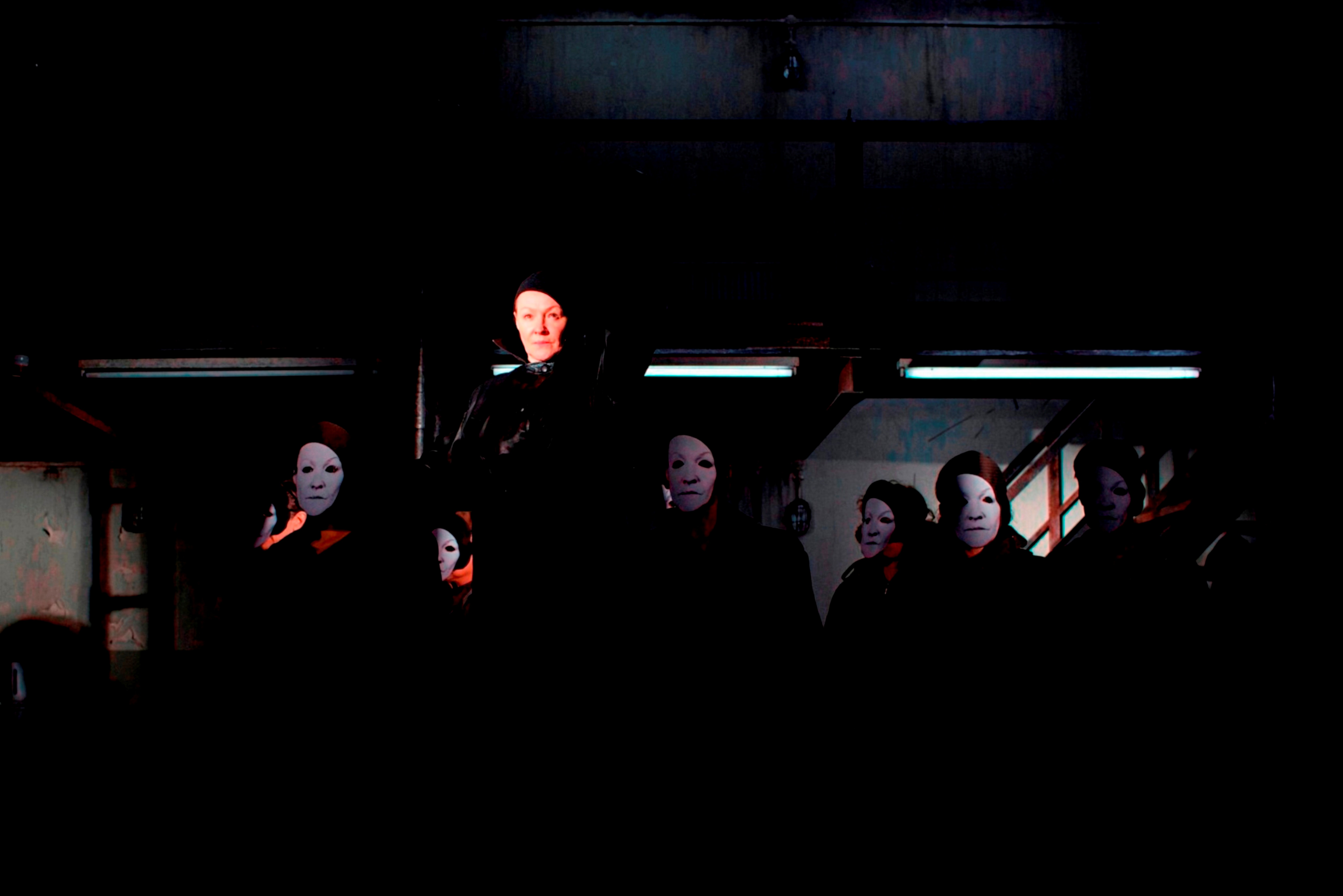 Bunny Christie’s set rips open the womb-like Donmar space, returning it almost to the warehouse that gives the theatre its name. Paint peels, institutional clutter lines the corrugated walls, metal walkways circle upwards, and always the CCTV cameras and searchlights observe. In this environment, unsoftened by so much as a cushion or a curtain, Gary Yershon’s amplified rock soundtrack echoes and re-echoes, assaulting us as we share this dismal space with the grey-tracksuited ranks of prisoners.