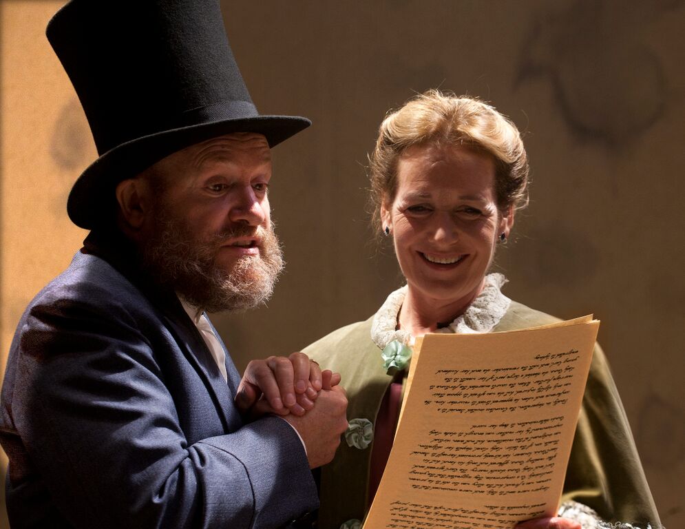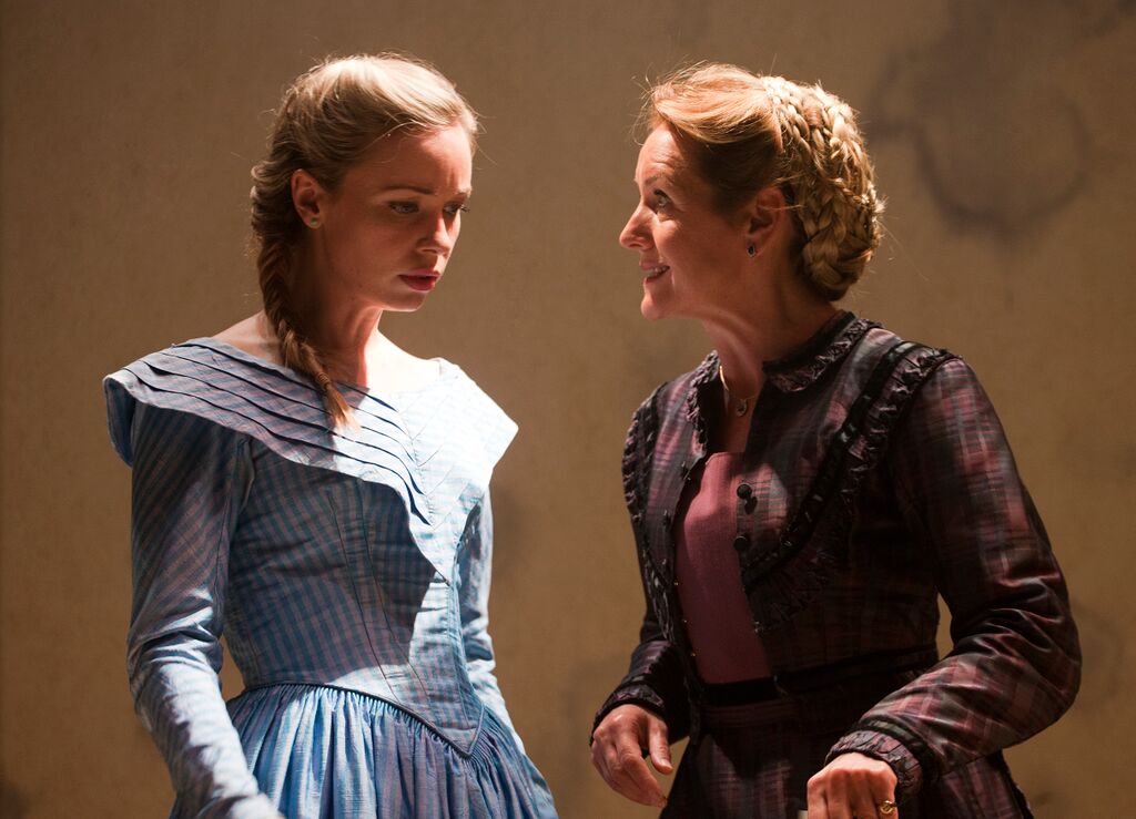 Which is where the wonderfully pragmatic lawyers come in – Tim Frances as the rotund perorator Sir William Patterson (as well as Trollope himself), Edward Halstead the rather more underhand executor Mr Flick. After contemplating spreading cash around to ease the passions of all concerned, they resolve on compromise rather than confrontation, coming up with the suggestion (and inveigling it into the head of Anna’s mother) that the new Earl should marry Anna and reunite the peerage with the pennies. The only problem, we learn in due course, being the pledge Anna has given to Daniel Thwaite (Will Rastall, also bonneting up as her maid), the son of the tailor who’d supported mother and daughter through their earlier indigence. (Antonia Kinlay as Anna, with Caroline Langrishe as her mother, pictured below.)