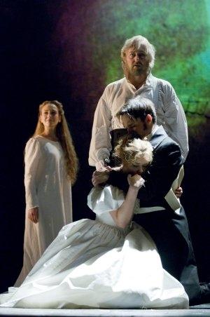 The subtext? Well, that's a bit of a downer too. Les Misérables paints a world turned upside-down, where moral wrong becomes right and right wrong, and where the hero spends his life denying his true identity. A white light shines each time there's a death, and it certainly comes beaming down quite a bit in the course of the evening. Political resistance is doomed to fizzle out into a grotesque, minor-key dance of death led by the scrofulous innkeeper turned fake baron, Thénardier, and his wife (a show-stealing comic double act by Ashley Artus and Lynne Wilmot, pictured above). The post-revolutionary tristesse is redeemed, if barely in the nick of time, by a spot of woolly religious transfiguration ("To love another person is to see the face of God") at the end.