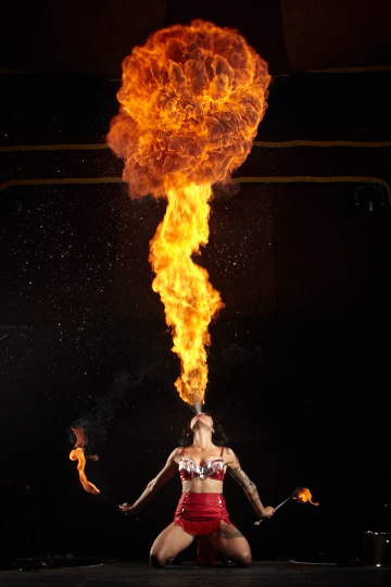 Circus is a broad church these days. It can be housed on the street, a grand proscenium stage and all points in between. For this latest incendiary reinvention of the form, it makes its way back into an intimate big top where the residual DNA of circus’s regular trappings seem all to be in situ. There’s bendiness and balancing, aerobatics and good old trapezing, fire-eating (pictured below) and sword-swallowing. But before you book for the whole family, be aware that the whole shebang is underpinned by something you never used to get at Billy Smart's: lashings - and I mean lashings - of sex.