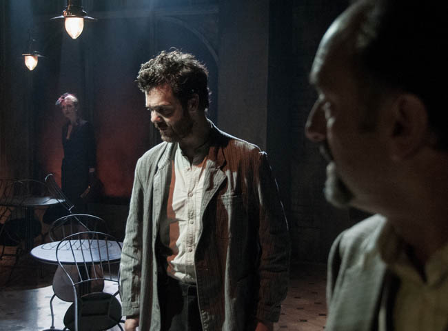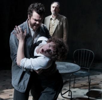 Yet, this sensational production is as seductive as its female lead. The play is tough and knotty and brutal, but it is also compelling and intelligent and eloquent. A cast of four deliver lyrical, rhythmic lines with lacerating precision and insight, while the set of peeling walls and cafe tables caked with dust in the half-light is imaginative and sensual. This powerful staging makes pain and suffering beautiful, terrifyingly so (pictured below: Vincent Enderby in foreground, Justin Avoth, Mark Tandy).